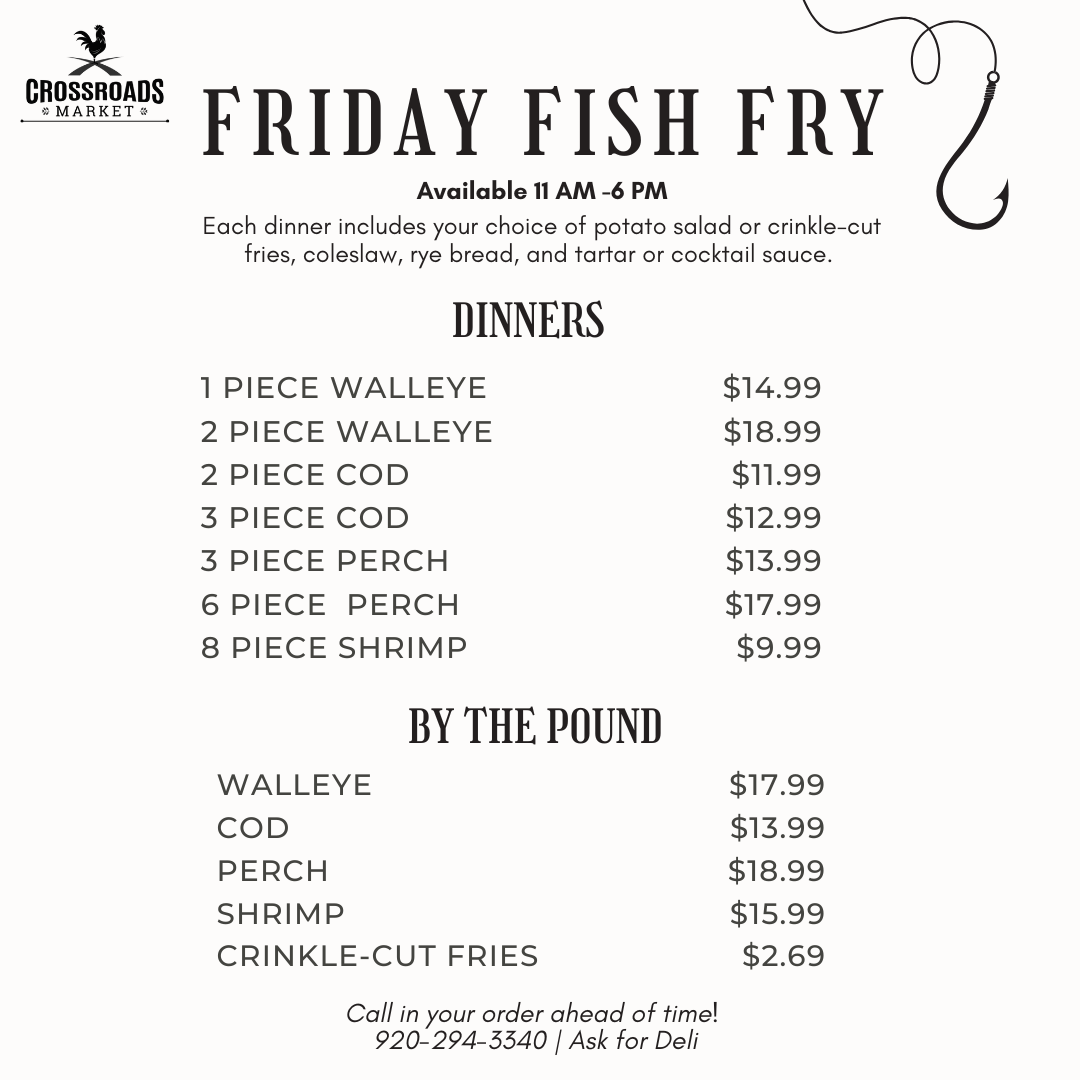 Hand-breaded and made fresh when you order.  Crossroads’ Rooster Road Deli has the BEST recipe for the freshest fish fry around.  Stop by every Friday and treat yourself to unexpected deliciousness!  Call ahead to place your order or shop for a few minutes while it’s prepared.  Available every Friday from 11 am – 6 pm.
